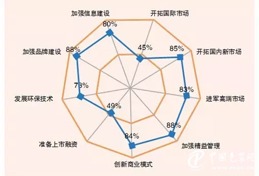 盡管如此,企業(yè)在風云變幻的市場環(huán)境中,必須沉著迎接轉型這場戰(zhàn)役。在“未來5年企業(yè)打算如何做”這一矩陣單選題中,9個選項中有5個選項,80%以上的企業(yè)明確表態(tài)“會考慮”,它們是:加強精益管理(88.24%)、加強品牌建設(88.24%)、開拓國內新市場(85.29%)、創(chuàng)新商業(yè)模式(83.33%)和進軍高端市場(82.35%)。會考慮加強信息建設(79.41%)和發(fā)展環(huán)保技術(72.55%)的比例也很高。明確表示會考慮融資上市、開拓國際市場的比例則未過半。
